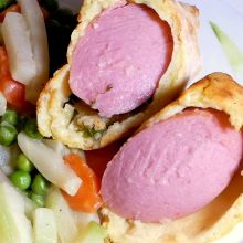 Erbsensuppe mit gebratenen Frankfurter Würsteln